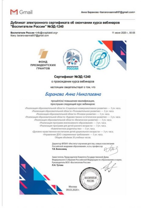 Профессиональная переподготовка: АНО ДПО «Межрегиональный институт развития образования», квалификация – воспитатель ДОУ